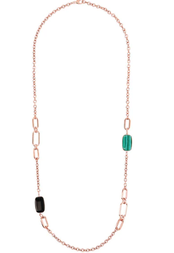 Collana lunga Bronzallure realizzata con lega Golden Rosé, placcata oro rosa 18kt. La collana, con chiusura a gancio, è caratterizzata da una catena rolo con maglie ovali allungate alternate a due pietre, onice nero e malachite, dal taglio a saponetta, con angoli smussati. Creazione che combina eleganza e stile, ideale da abbinare all’ampia gamma di gioielli della collezione Alba, dai tagli raffinati e originali, perfetti da indossare in ogni occasione. Lega brevettata Golden Rosé Designed and made in Italy Pietre naturali selezionate Nickel free, cadmium free Ipoallergenica Materiale: Golden rose Lunghezza (cm): 91.4 Peso (g): 55