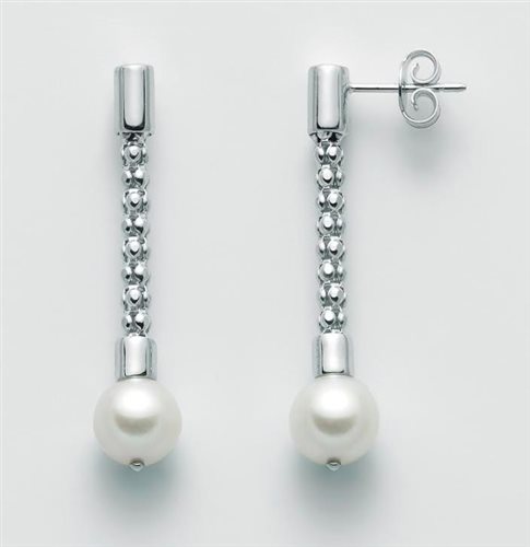 Orecchini donna , argento 925% rodiato , maglia modellofope , pendente lunghezza cm 3.5 , perle bianche coltivate in acqua dolce , mm 8-8.5. Immagine indicativa , la confezione può variare di forma e colore , scatola garanzia originali.